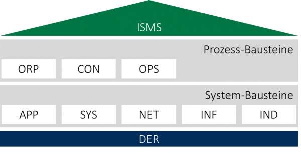 Die Prozess-Bausteine unterteilen sich in die folgenden Schichten: Sicherheitsmanagement (ISMS), Organisation und Personal (ORP), Konzepte und Vorgehensweisen (CON), Betrieb (OPS), Detektion und Reaktion (DER). Innerhalb der System-Bausteine werden die Schichten Anwendungen (APP), IT-Systeme (SYS), Netze und Kommunikation (NET), Infrastruktur (INF) und Industrielle IT (IND) unterschieden. Die BSI-Standards ergänzen das IT-Grundschutz-Kompendium und bieten detaillierte Anleitungen für den Aufbau und Betrieb eines ISMS.